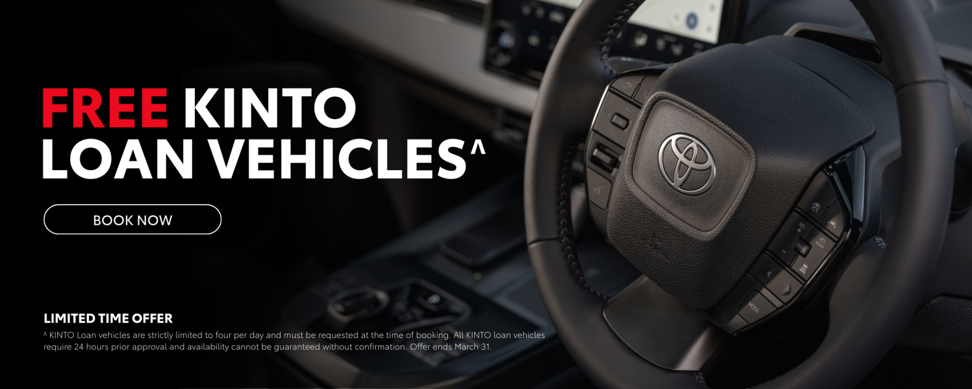 ^ Loan vehicles are strictly limited to four per day and must be requested at the time of booking. All KINTO loan vehicles require 24 hours prior approval and availability cannot be guaranteed without confirmation. Offer ends March 31.